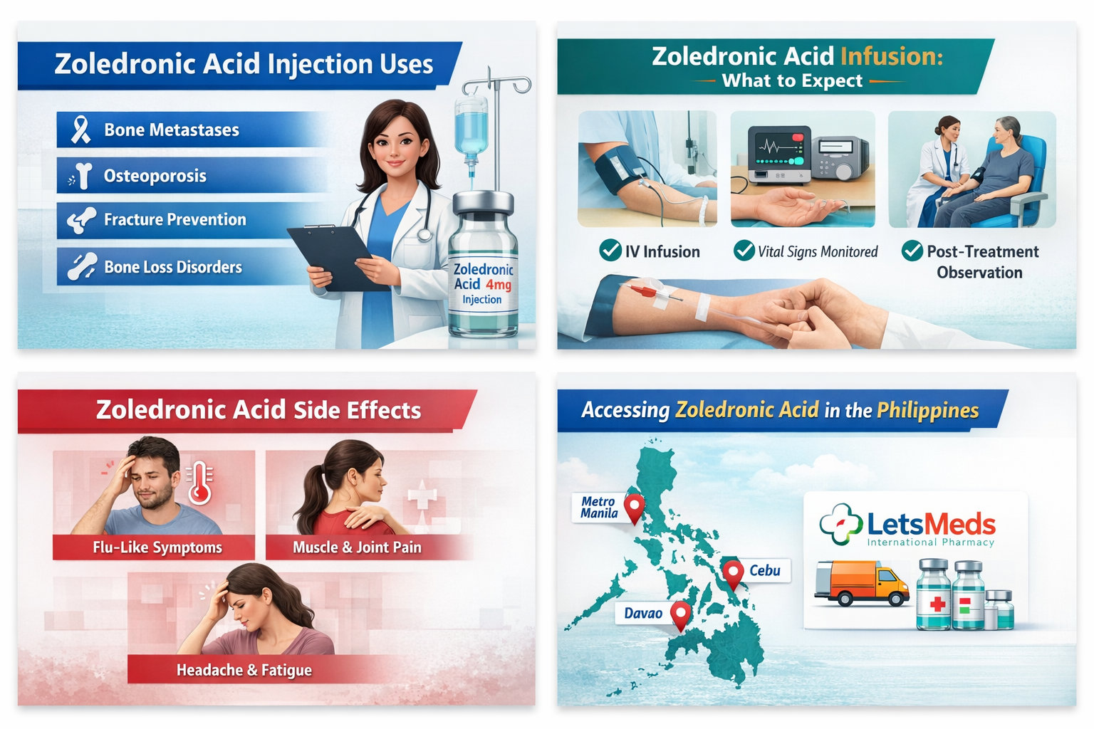 In areas where local availability is limited, some patients consider licensed international pharmacies such as LetsMeds, which assists patients in accessing zoledronic acid injections at affordable rates with delivery support across the Philippines, including Metro Manila, Cebu, and Davao, under doctor supervision.